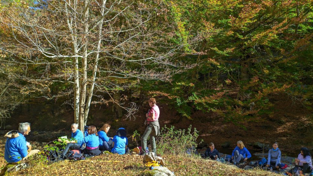 Son casi las 12,00 h. Y nuestro organismo ya pide que repongamos energías. Hemos cogido de nuevo la pista forestal flanqueando el hayedo a nuestros costados.  Jesús nos dice que en menos de 15 minutos llegaremos hasta un pequeño merendero que nos servirá de lugar idóneo para descargar las mochilas. Dicho y hecho. Unas mesas de piedras redondas, un lugar bucólico junto al arroyo Vargas y unas ganas indisimuladas por satisfacer necesidades, nos apremian a buscar entre los pertrechos de la mochila las viandas reconfortantes de todo senderista. El rato de asueto gastronómico es también motivo de conversación, intercambio de delicatesen y valoraciones de lo que la ruta nos ha ofrecido hasta el momento.