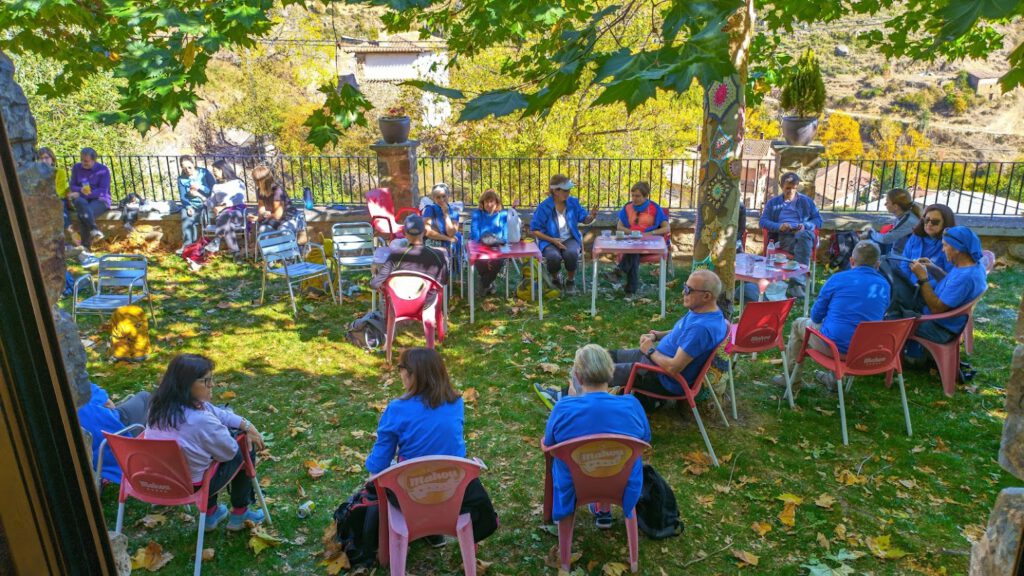 En un principio, estaba previsto que pudiéramos hacer el almuerzo en el restaurante del pueblo, pero parece que a última hora no fue posible porque ya estaba reservado con anterioridad por un grupo de cazadores. Así que, otra alternativa era hacerlo en una casa solariega del municipio, temporalmente deshabitada y propiedad de la familia de Alfonso, nuestro guía local. Pero a última hora la mejor elección fue ocupar el jardín adjunto al bar del pueblo, dotado con sillas y mesas, convenientemente apiladas junto a la pared del bar.