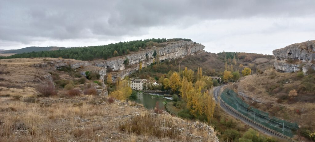 Dejando atrás estas formaciones cavernícolas, enfilamos la cómoda senda del cañón. Apenas hay otros atractivos que no sean la contemplación a distancia de otro elemento de singular belleza de Las Tuerces: dos pronunciados salientes de la formación rocosa sobre la que se asientan, a modo de dos pérgolas gigantes, que parecen desafiar la gravedad.