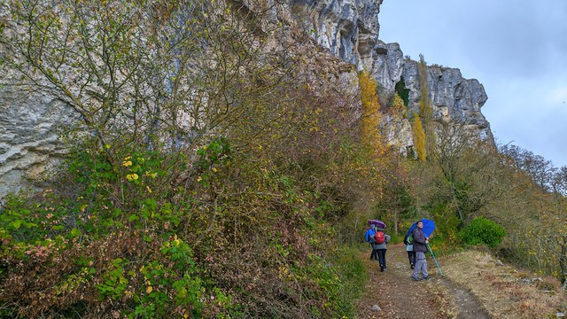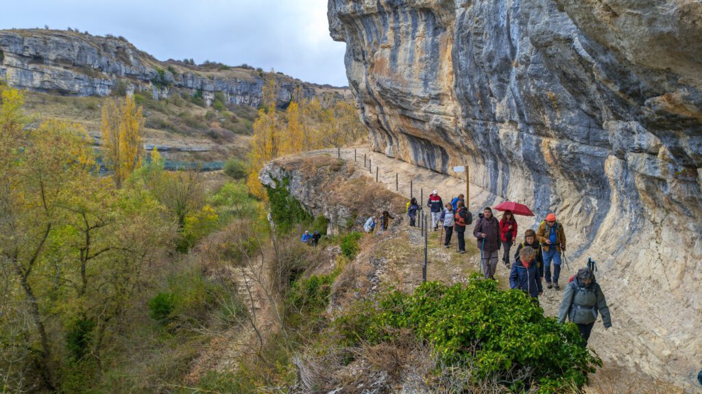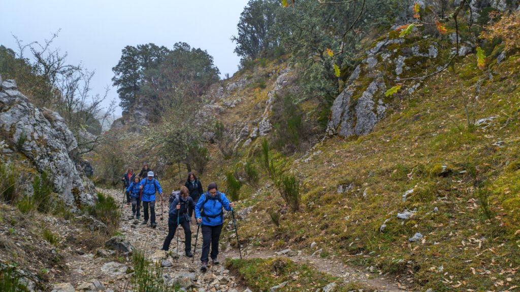 Vamos descendiendo, atrás quedan los longevos y venerados tejos. El camino es ligeramente distinto al que hemos traído, aunque lo retomamos en un punto intermedio, hasta llegar al punto de parada de nuestro autobús. Alrededor de 11 Km. han recorrido nuestras botas por estos paisajes de encanto. Y una vez que hemos llegado, hacemos la deseada “comida de mochila”, acomodados sobre una pequeña pared que acota el aparcamiento de vehículos, para iniciar enseguida la segunda ruta prevista: la visita al cañón de La Horadada.