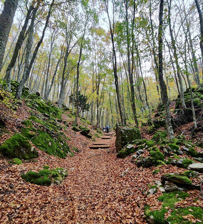 A poco que vamos avanzando, el camino se estrecha y nos obliga a caminar por un terreno empedrado, estrecho y con la lógica precaución de asentar bien la pisada para evitar episodios no deseados por lo resbaladizo del suelo y, sobre todo, la humedad de las piedras que jalonan nuestro tránsito.