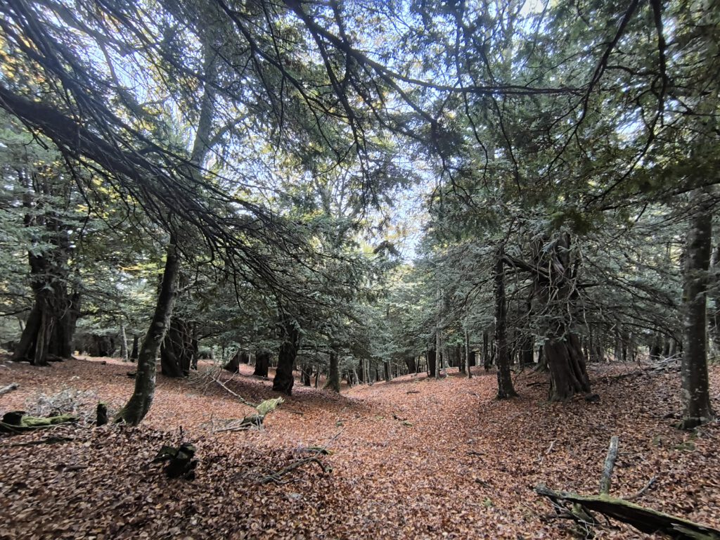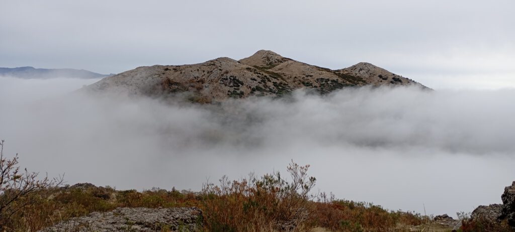 No abandonamos del todo los ejemplares de esta especie que vamos admirando en nuestro ascenso y llegamos a un mirador desde el que se obtiene unas espectaculares vistas de la montaña palentina…si el día está claro, algo que no sucede en este día de nuestra visita. Pero a cambio, obtenemos otra imagen espectacular: la niebla se ha adueñado de parte de la montaña. Y digo “de parte” porque se extiende por debajo de las cimas montañosas que podemos contemplar, dejando al descubierto los picos más altos y ocultando los valles que se extienden bajo su falda, a la vez que en su lado más oriental apunta un brillo solar con tonos amarillentos, que contrasta con el gris de la niebla en su horizonte y la luminosidad plateada que irradian las cumbres visibles que la niebla ha respetado. Parece una estampa onírica que la naturaleza nos brinda, después de salir del suelo umbrío que alberga este árbol de leyenda que hemos contemplado. Lugar de fotos para dejar grabadas las imágenes de un paisaje inusual.