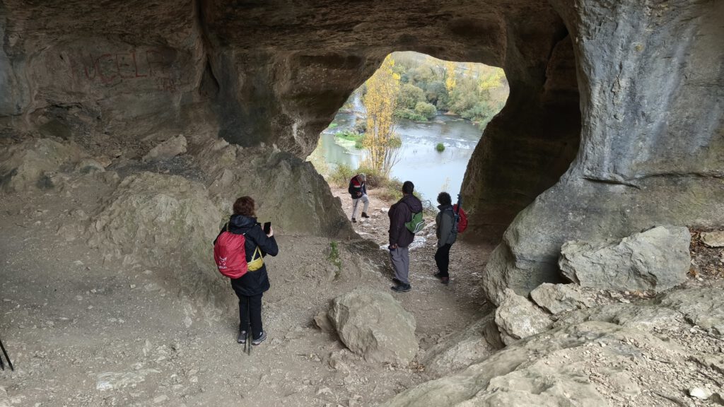 Y allá nos encaminamos. El cañón es una garganta por la que el río Pisuerga se ha abierto camino en el terreno calizo en el que se ubica el espacio natural de Las Loras y Las Tuerces. El recorrido es corto, así que visitamos los rincones más singulares que se cruzan en nuestro trayecto. Y lo más inmediato que encontramos es la presencia de dos cuevas, de entre la muchas que encierra el cañón, una de ellas con un atractivo especial: se trata de una cueva que, una vez traspasada la corta zona de oscuridad que toda cueva presenta, al final de la misma y tras un corto tránsito desde la entrada, donde hay de doblar el espinazo para acceder a su interior, nos sorprende una estancia radiante y luminosa: la cueva se convierte en un espacio con luz solar que forman tres chimeneas comunicadas con el exterior, y formadas por la acción erosiva del agua que ha perforado las entrañas de esta cavidad para asombro del visitante. La otra cueva apenas ofrece otras características que la de una oquedad oscura y de corto recorrido en su interior.