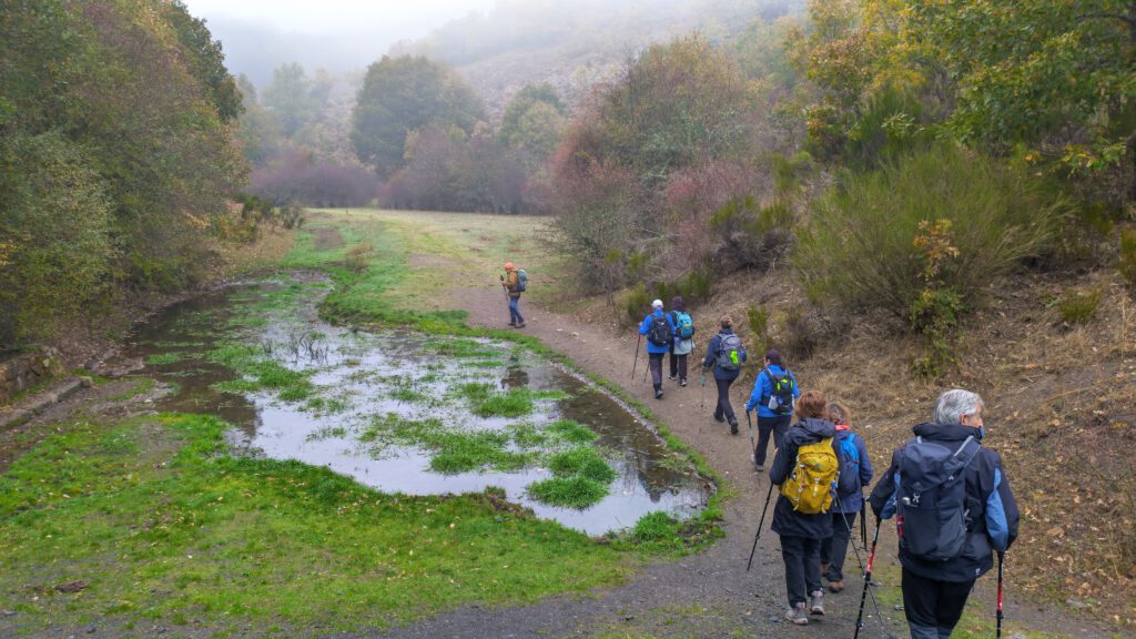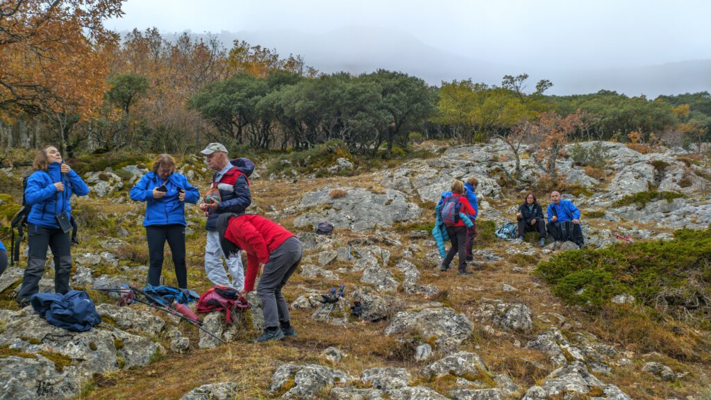 Son poco más de las 10,15 h. Estamos ya bajando del autobús y se inicia el ritual de siempre: comprobación de pertrechos del caminante, ajustes, estiramientos, logística de distribución de las dos comidas que haremos en nuestro periplo senderista, etc. Porque hoy haremos la comida de mochila, es decir, dos comidas: una, a media mañana, a la hora de costumbre, y otra, la de mediodía, de las viandas de la mochila. No tenemos un restaurante cercano para satisfacer nuestras necesidades más básicas.
