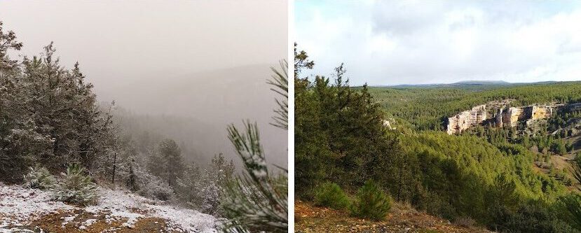 Al ascender por el sendero, el bosque comienza a hacerse más denso, mostrando una variedad de especies que caracterizan este entorno como la sabina albar que destaca especialmente, tanto por su tamaño importante como por las formas curiosas de sus troncos y ramas. Quejigos y encinas acompañan a las sabinas y aportan diversidad y carácter al paisaje. Bajo los árboles crecen jaras y varios tipos de arbustos difíciles de catalogar en esta época del año y toda la naturaleza está envuelta en líquenes y musgo.
