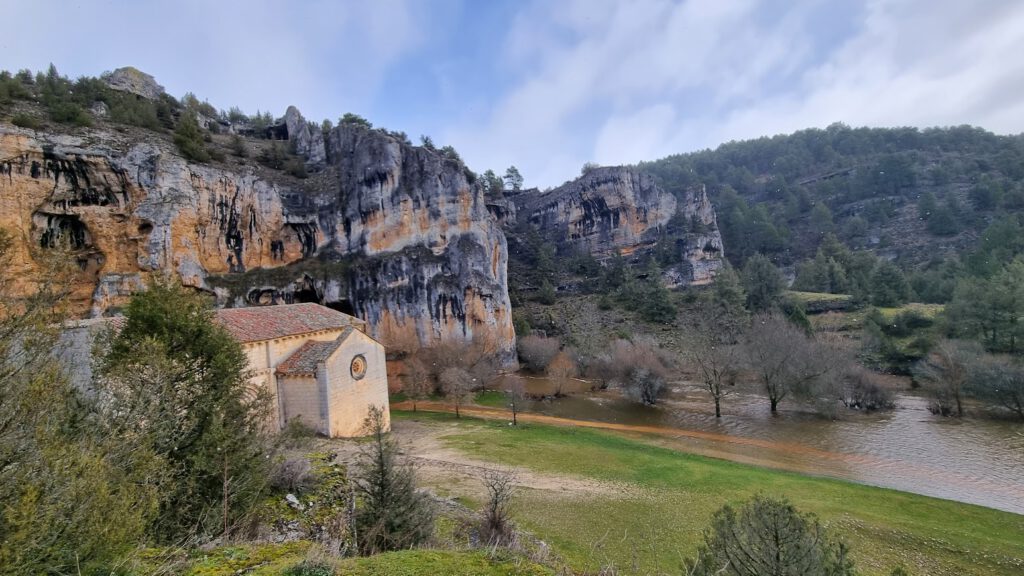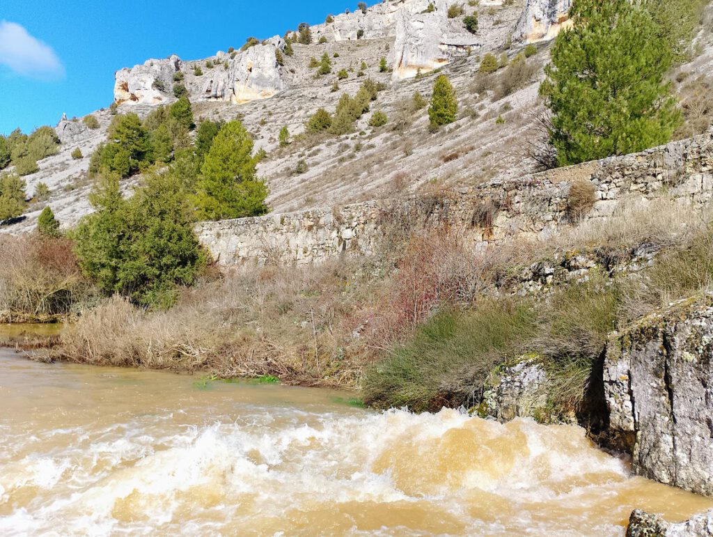 No podemos abandonar este lugar sin hacer dos visitas: la primera es al nacimiento del Río Ucero donde los paneles nos explican que en este inmenso Karst lleno de cuevas, simas y agujeros hay también sumideros de aguas subterráneas que afloran en determinados lugares como es el caso de esta surgencia del Río Ucero. El Lobos pierde su nombre y se une al Ucero que nace en estos momentos con gran fuerza y un potente cauce. Surgen dudas sobre si el Lobos tributa al Ucero o viceversa e incluso si ambos pueden ser el mismo rio porque puede ser que el Lobos se sumerja en la montaña y luego aflore de nuevo…más bien parece ser que el Lobos que nace en Mamolar (Burgos) transita por la superficie y el Ucero es fruto de las aguas subterráneas de la sierra.