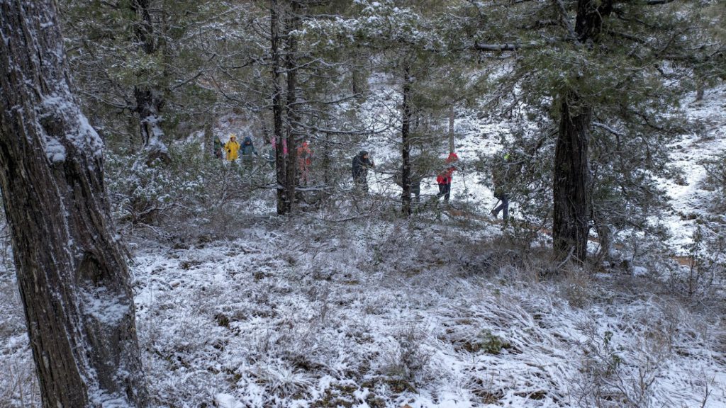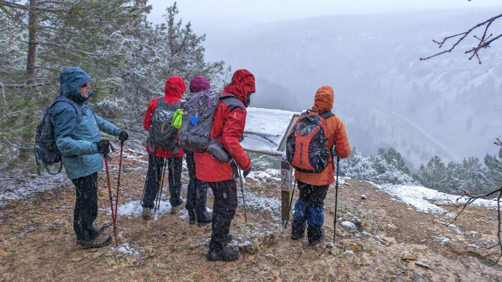 Ya en el mirador de las Gullurías, nos equipamos con chubasqueros porque la nevada se intensifica, lo que nos impide disfrutar de la amplitud de las vistas sobre el cañón desde este punto. A pesar de las condiciones meteorológicas, bien protegidos, comenzamos el descenso por el bosque, en busca de los atractivos rocosos que son característicos también de esta zona.