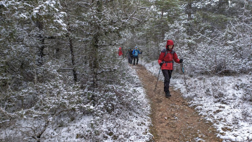 El tiempo por ahora no cambia por lo que la nieve se va depositando poco a poco, formando un delicado manto blanco que va transformando el entorno de forma gradual y constante, hasta encontrarnos en un paisaje blanco de belleza serena y casi mágica. A pesar de la nieve, no hace frío; la precipitación consiste en un revoloteo suave de copos que nos va cubriendo poco a poco también a los senderistas.