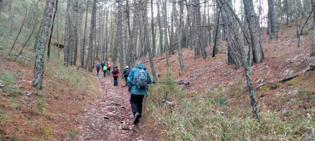 El camino, sin exceso de barro, resulta cómodo. Las sensaciones que experimentamos son inmejorables, pues el ambiente invita a disfrutar y relajarse mientras seguimos subiendo la ladera hasta encontrarnos con los pinos de grandes agujas que ya están cubiertas de nieve, siendo inevitable que alguna compañera piense en los árboles de Navidad, evocando recuerdos festivos.