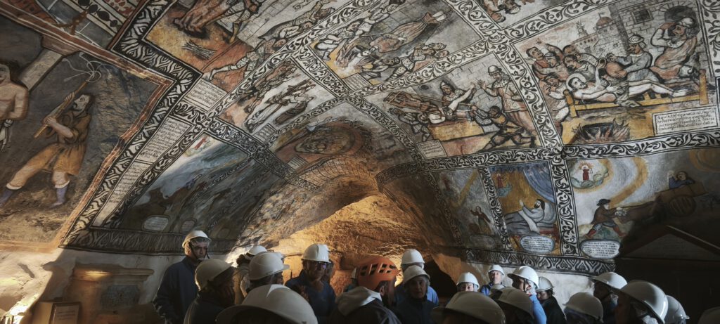 La visita comienza con el reparto de cascos protectores y nuestro guía nos introduce en el mundo subterráneo con un video en el que se explica que hay varias especies de invertebrados acuáticos muy especiales y raras que han sido descubiertas en estas aguas profundas y obscuras, siendo un paraíso también para varias especies de murciélagos como el llamado de herradura. Es importante no molestarlos durante las visitas, asique la luz de la cueva se va encendiendo a nuestro paso para mostrarnos únicamente aquello que es necesario. Empezamos con la formación de las estalactitas y estalagmitas que se forman por el calcio que se va depositando al disolverse la roca al entrar el agua por una gran grieta de la bóveda. En este caso la estalagmita no se forma porque una pila recoge el agua que cae y antiguamente se le atribuían propiedades curativas para la vista. Las zonas superiores ya están secas, pero hay 6 pisos de galerías, de forma que la mayor actividad acuática está siempre en la más profunda. No solo es el Guareña el que recorre estas galerías son también el Trema y el arroyo Villamartín.
