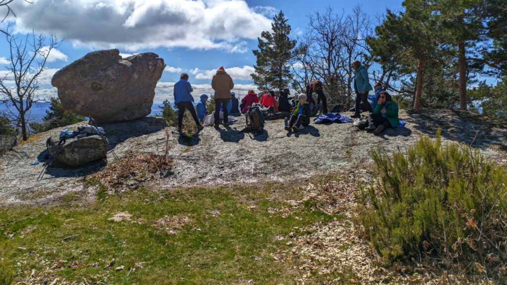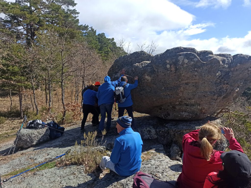 ¿Qué nos faltaba? La reposición de energías. ¿Algún lugar más apropiado que a los mismísimos pies de la piedra andadera? Pues seguramente no. Y aquí, además de probar nuestras fuerzas empujando a este singular specimen rocoso, descargamos las mochilas y  desenvolvemos el papel de nuestros bocadillos. Lugar idóneo, temperatura excelente y un sol radiante  acompañan nuestro rato de asueto. Y como en todo momento de descanso para el bocata, no falta la conversación distendida, las impresiones espontáneas, la bota de vino que corre entre los grupitos y…en este caso, a nuestra espalda se ofrece una maravillosa vista del Pantano de La Muedra. Estamos casi a 1.500 m. de altura y muy cerca de los lindes con la vecina población de Salduero. Y nuestro pantano está ahí. Casi a tiro de piedra, lo que confiere al enclave otra singularidad paisajística que reafirma nuestra identidad provincial.