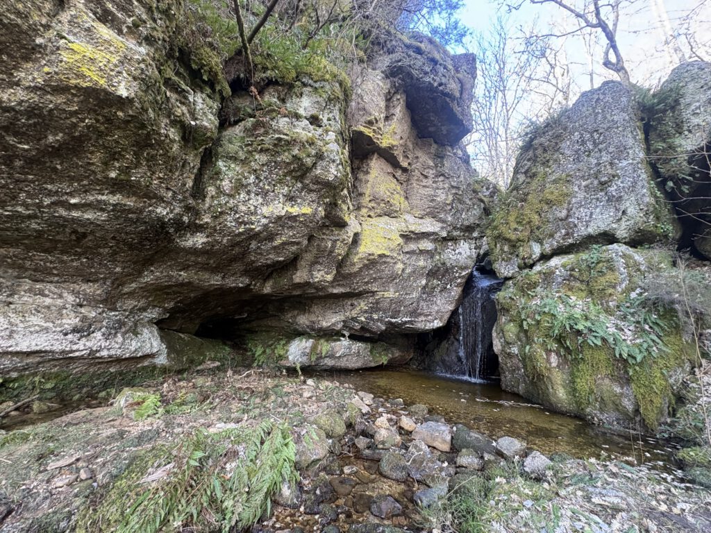 La vista no es muy distinta a la que hemos tenido desde el anterior punto de observación, pero lo interesante de este rincón es que, bajo su soporte pétreo, se encuentra una cascada que, habitualmente no lleva agua, pero en esta ocasión hace honor a su nombre. Lugar para obtener la fotografía deseada y el recuerdo de un lugar con encanto.