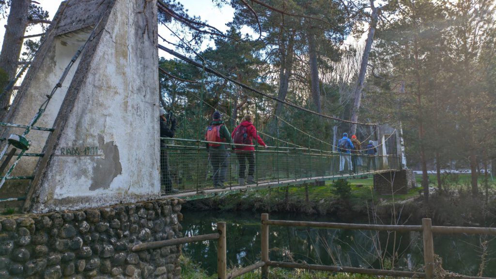 Los primeros pasos que enfilamos son para cruzar un vetusto, pero bien conservado,  puente sobre el pequeño cauce del Duero, construido con materiales de madera sobre el vano y de acero para la estructura de seguridad y sujeción.
