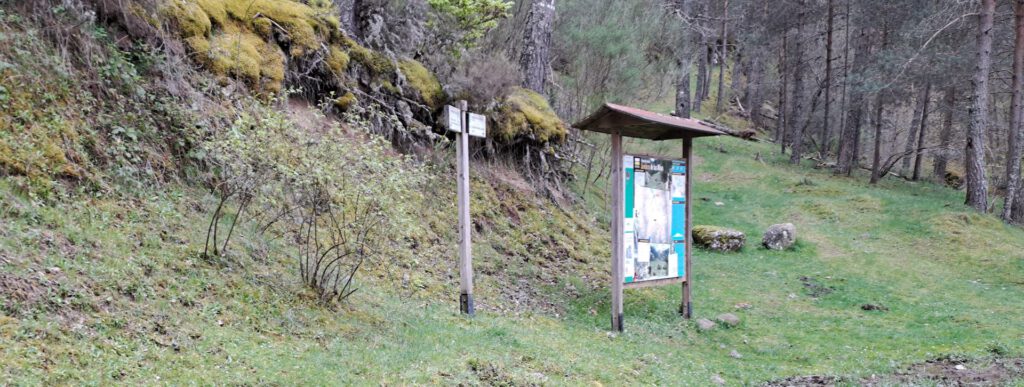 Ya en el parking nos preparamos para la partida, la mañana está fresquita y la niebla humedece el ambiente por lo que nos abrigamos un poco, aun sabiendo que en unos minutos de subida a buen paso nos empezarán a sobrar las chaquetas. Preparados y con los walkis conectados pasamos ante el gran panel informativo sobre el Sendero de las Nilsas y tomamos la senda de la derecha con el apoyo de los bastones que ya en el inicio son de gran ayuda ante el ascenso de casi quinientos metros de desnivel que tenemos por delante.