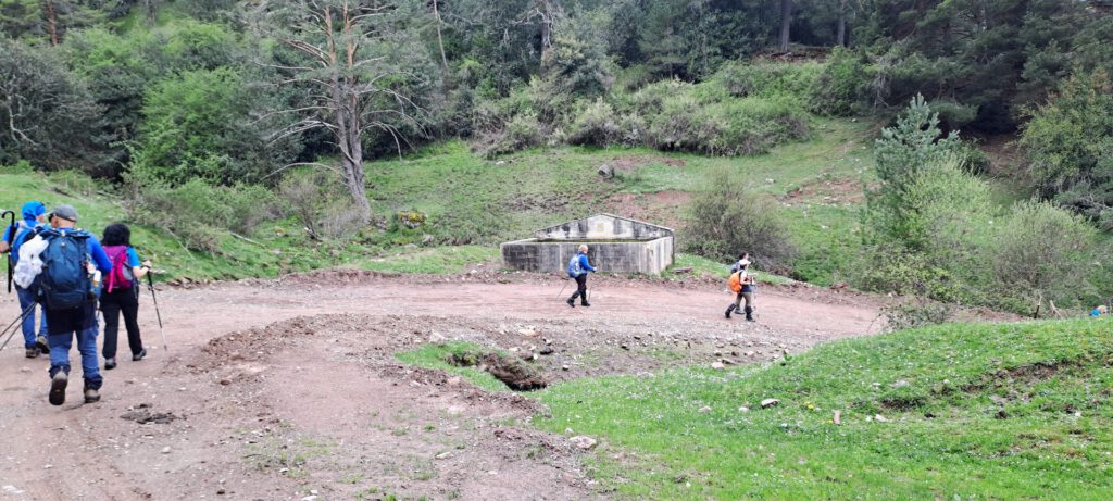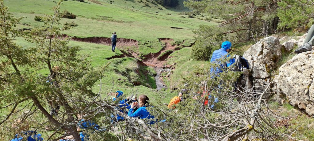 Llegamos hasta al paraje donde almorzaremos sentados sobre las rocas. Frente a nosotros descubrimos un paisaje poco habitual, la verde pradera queda rasgada por una amplia y profunda brecha de tierra rojiza, pero el sumidero apenas lleva agua, con lo cual, aunque sea temporalmente, parece evidenciar la amenaza comentada anteriormente.