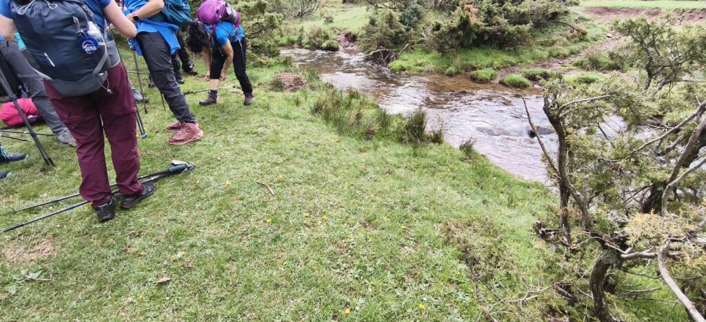 Los sumideros y cauces de agua son una maravilla de la naturaleza, pero a la hora de cruzarlos no son tan deseados, nos iremos topando y evitando el serpenteo de agua hasta que no queda más remedio que pasar sobre la misma, hemos de cruzar Río Frío y el paso sobre piedras no es una opción; de manera que elegimos entre descalzarnos o el uso de calzas de plástico, siendo esta opción la mayoritaria, pasando todos sin contratiempos.