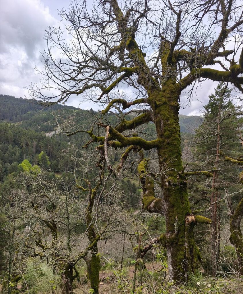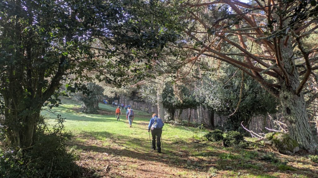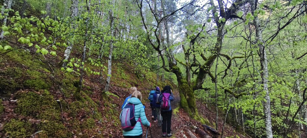 Distancia se hace un poco larga porque la pendiente va in crescendo y el sendero no siempre es fácil, detalles que se llegan a olvidar al atravesar esos largos tramos de bosque con una gran diversidad de arbolado cono hayas, robles, pinos perfectos y bien dispuestos, otros de formas fantásticas tan típicas del arbolado que intenta medrar entre circunstancias adversas y junto a ellos, incluso formando parte de los mismos, numerosos acebos.