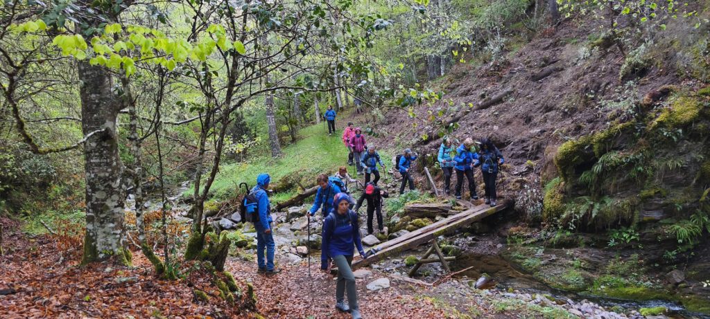 Estamos en el Valle del Arroyo de Cuesta Abejares y nos hemos situado al nivel del río que cruzamos por primera vez sobre unos tablones, después cruzaremos en bastantes ocasiones y es de agradecer que en todas ellas haya puentes, aunque con la madera muy deteriorada por la humedad, resbaladiza y oscilante a nuestro paso, su presencia es un regalo para poder recorrer este bello paraje que a cada paso se asemeja más a esos Pirineos que, al visitarlos recientemente, todavía tenemos en la mente.