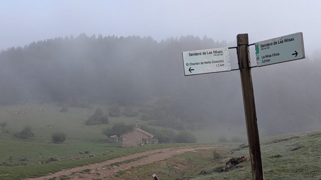 Un poco más arriba podemos divisar, a cierta distancia y envuelta en la niebla, la Casa del Dólar, otro refugio más moderno y en el poste indicador vemos que tan solo hemos caminado 1 km y 300 m y que quedan 2 km hasta la Nilsa Chica.